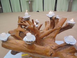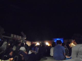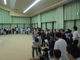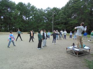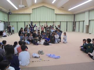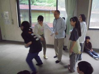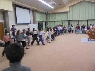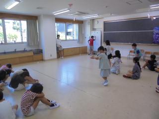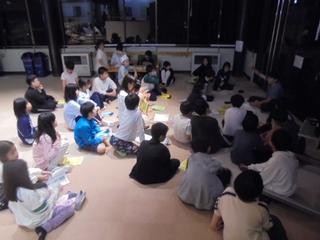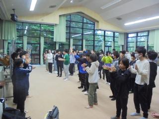 食後はキャンドルファイヤーをしました。最初に、私が火の神として登場し、火の子達と掛け合いをしました。子供たちのナレーションが上手で、静かな雰囲気を作り上げてくれました。その後は「じゃんけん列車」や「マイムマイム」で元気いっぱいに体を動かしました。