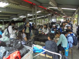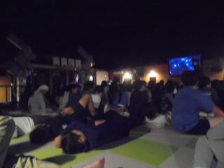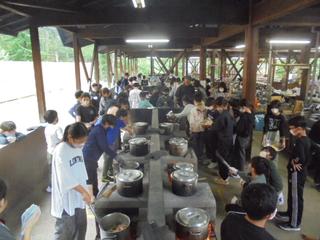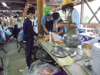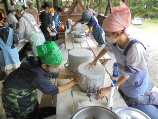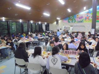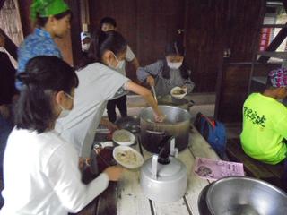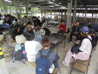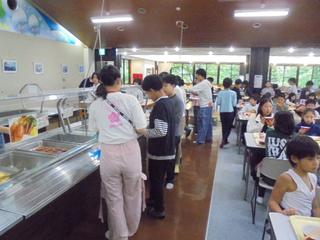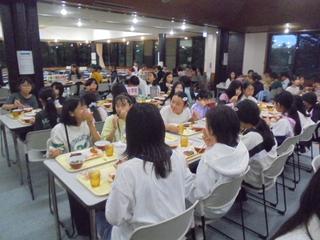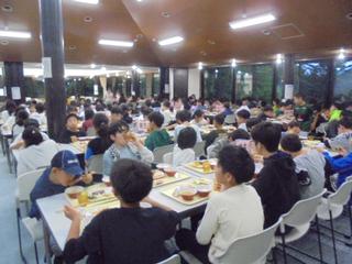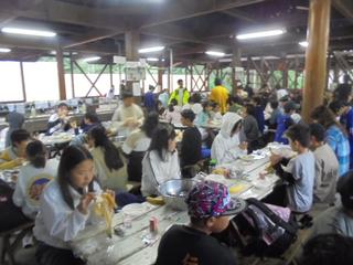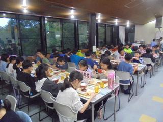今日の夕食は初めて所内の食堂でいただきました。これまでは野外での食事が続いていたので、室内でテーブルと椅子に座って食べるのは贅沢な気分!子供たちもゆったりと食事を楽しんでいる様子でした。ご飯とスープはおかわり自由で、みんなお腹いっぱいに。夜の活動にもエネルギー満タンですね!