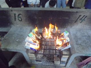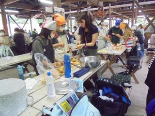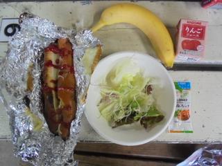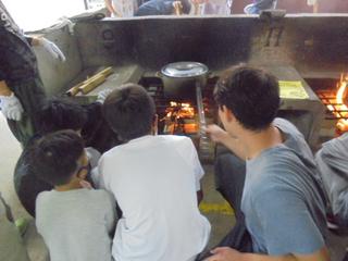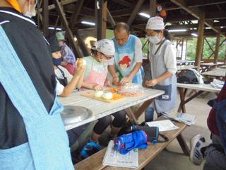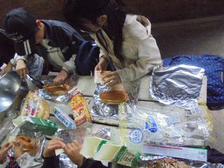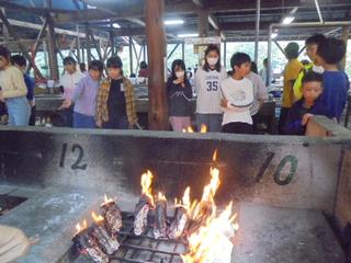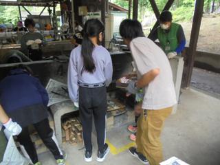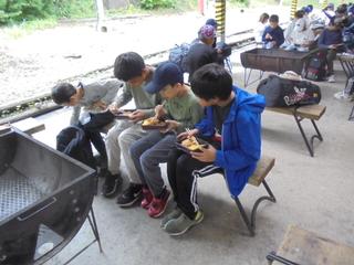 朝の集いを室内で行った後、朝食の「カートンドックづくり」に挑戦しました!材料は、パン、大きなウィンナー、チーズ。これらをアルミホイルで包み、準備しておいた牛乳パックの中に入れて直火で焼くという、アウトドア料理です。焼きあがったものは、ふわふわでジューシー、チーズがとろけて、とてもおいしかったです。