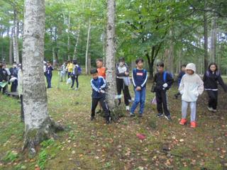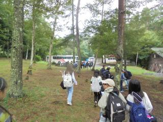 学校を出発し、バスは中央高速道路へ。談合坂でトイレ休憩。車内はバスレクで大盛り上がり。そこから小淵沢インターで降り、しばらく車を走らせて森を抜けると、思いのほか早く自然の家に到着!予定より30分以上前に着いたので、空気が美味しいとみんなで深呼吸。シカの森では、鹿の糞が歓迎してくれましたが、それもまた自然の一部ですね。