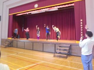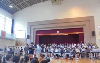 AMWの皆さんは特別に2曲の歌を披露してくださり、子供たちは大歓声!また、全員で「かきくけかきお」を一緒に踊り、アリーナが笑顔と拍手でいっぱいになりました。その後の給食の時間も一緒に過ごし、楽しく交流することができました。