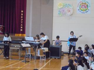 中休みには、アリーナで有志の児童と職員によるミニコンサートも開かれました。楽器演奏をバックに、ボーカルの児童が歌声を響かせてくれました。聴いていた子供たちは大盛りあがり! 手拍子や歓声でアリーナ全体が笑顔に包まれました。さらに、保護者の方々も足を運んでくださり、拍手で演奏を後押ししてくださいました。