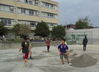 スコップやレーキを手に、一生懸命作業を進める職員たち。その様子を見ていた下校途中の子供たちが、「先生がんばってー!」と大きな声で応援してくれました。その声に励まされ、職員一同、さらに力が入りました。