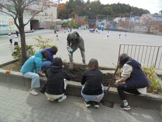 この花壇は、夏にはひまわりが元気に咲いていた場所です。(こちらもガーデニングボランティアの皆さんが植えてくいださいました)季節ごとに花の姿を変えながら、いつも子供たちや来校者をあたたかく迎えてくれています。