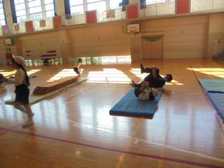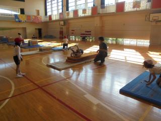 授業では、いきなり跳び箱に挑戦するのではなく、前転の練習コーナー、マットで段差をつくったコーナー、マットの上に1段の跳び箱を置いたコーナーなど、段階的に練習できる工夫がされていました。