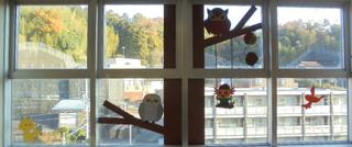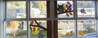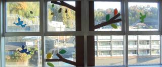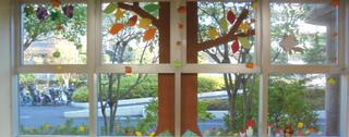 校舎ホールの窓に、装飾ボランティアの皆様が、すてきな木の飾りをつくってくださいました。1階から4階まで、まるで校舎の中に大きく伸びる1本の木がそびえ立っているように、階ごとに幹がつながっています。