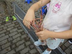 生活科で育てたアサガオの花が咲き終わった後、つるを利用してリースを作りました。根元から茎を切り、支柱から外します。ツルを伸ばしてから、丸めてできあがり。支柱からつるを外すのに、悪戦苦闘しながらがんばる子どもたちが素敵でした!