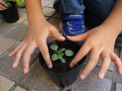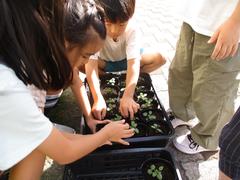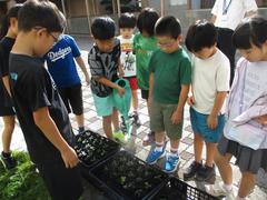 子ども達それぞれが、トマト、ピーマン、なすから育てたい野菜を決め、鉢に苗を植えていました。