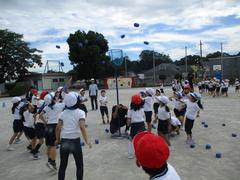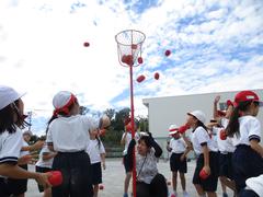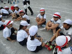 片平小学校の運動会のねらいのひとつに「かかわりの中で育つ心」があります。異学年の交流の場を設け、目標を達成するためにともに力を合わせて協力する活動しています。写真は1・2年生の団体競技の玉入れ。ただ玉入れをするのではなく、1年生と2年生がどうしたらたくさん玉を入れることができるかを話し合う作戦タイムを設けています。そんな子どもたちの姿も運動会ではご覧ください。