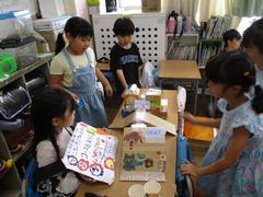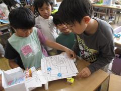 2年生は生活科の学習で「おもちゃランドへようこそ」の学習をしています。この単元では、身近にあるものを使って遊びに使うものを工夫して作ったり、遊び方を考えたりする中で遊びを創りだすことのおもしろさに気付き、夢中になって楽しく活動することをねらいとしています。風の力や磁石の力、ゴムの力を使った動くおもちゃを考え、グループで協力しながら、1年生を招待して一緒に遊びました。