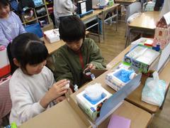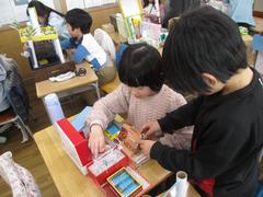 2年生の図工では、空き箱を使って「小さなともだち」の家をつくりました。「小さなともだち」とは、白い石やペットボトルのキャップに目や口を自分で作った愛着のあるともだちです。今日は作品交流。お互い作った家に招待するという設定で、小さなともだちと一緒に遊びに行きました。「ふわふわのベットで皆と一 緒に寝ようよ。」「合体させたら、もっと楽しく なるのかな。」「○○さんのおうちで、友達と プールに入って楽しかった。」などなど。 夢中になって遊ぶ中に、友達の作品の良いところを見つけて褒め合う言葉がたくさん聞くことができました!