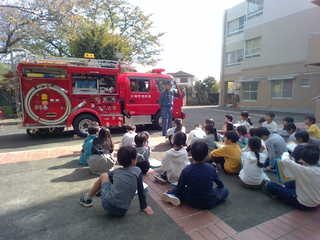 麻生消防署、栗木出張所の方々を招き、消防士の仕事や火災予防について教えていただきました。消防自動車を見せてもらったり、防火服を着せてもらったりして、子どもたちは大喜びでした。消防士の方にたくさんの質問をして意欲的に学んでいました。