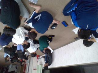室長・保健・食事・生活の係別に集まり、1日目の活動をふり返って、よくできたことや課題、予定の変更などを確認しました。先生や友達の話をメモするなど、係で聞いたことを部屋の仲間にしっかりと伝えようとする、くりっ子たちでした。
