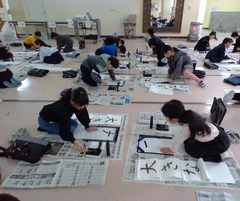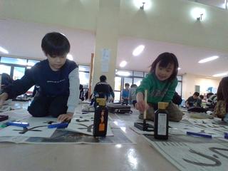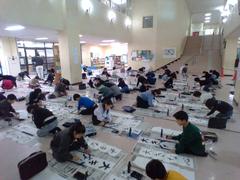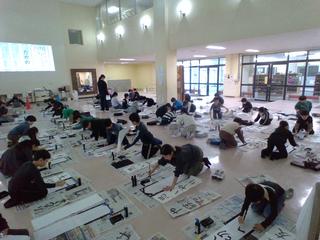 ホールで、書き初めを行いました。3年生から始まった毛筆の学習。