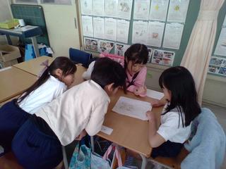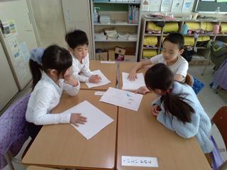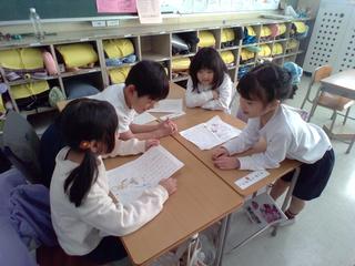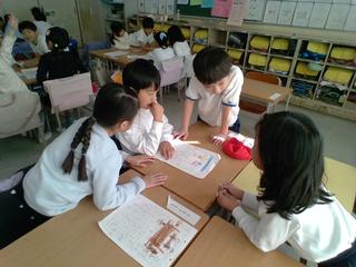 1年生が、冬休みの思い出の伝え合いをしました。どのグループも、友達の発表を前のめりになって聞いたり、書いた文章や絵をよく見て質問や感想を考えたり、意欲的に活動していました。自分の思い出を友達に伝えることができ、質問や感想をたくさん言ってもらえて、みんな満足そうでした。