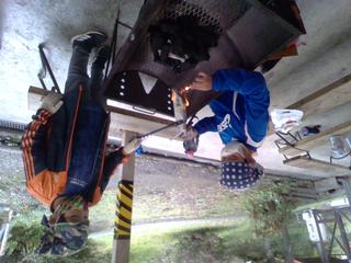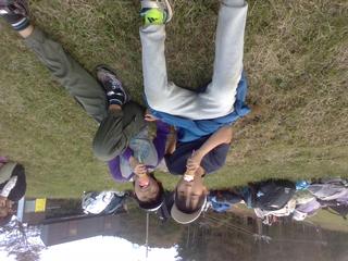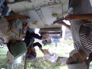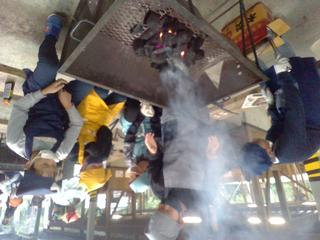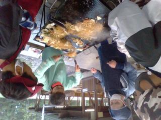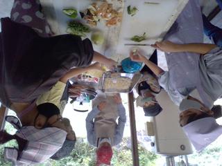 調理と火起こしを開始しました。「だれか、玉ねぎの切り方教えて」「火、怖いんだけど~」「けむたいよ~」