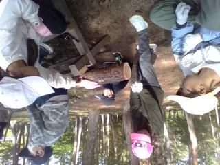 アカマツの丸太切りを通して、林業や森と人との関わりを学びました。くりっ子に丸太きりの秘訣を聞いたところ、「秘訣は、気合と気合と気合と気合と、最後に気合」だそうです。