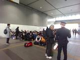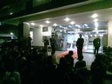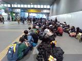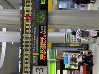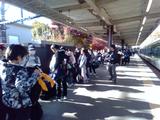 専用電車は、登戸駅に到着。小田急線のラッシュ時間と重なり、時間調整で待機しています。帰りもJR登戸駅では、電光掲示板に温かいメッセージが書かれていました。