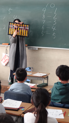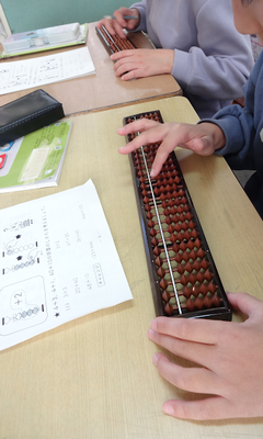 講師を招き、そろばんの学習を行いました。そろばんを初めてさわる児童も多かったのですが、説明をよく聞きながら挑戦しました。友だちと教え合ったり、熱心に計算をしたりして、答え合わせでは「御明算(ごめいさん)!」と、友だちとほめ合っていました。