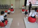 「いっぱいからだをうごかそう!」をテーマに、バランスボールに乗って体のバランスをとったり、力強くジャンブしたりする活動を行っています。