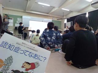 講師の方に来ていただき、認知症について学習しました。認知症になる原因や症状、接し方についてスライドやテキスト、寸劇を通して考えながら学びました。