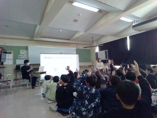 総合の学習で聴覚にハンディを持った方による手話講話がありました。聴覚にハンディを持っている人とは「手話・指文字・筆談・口話・空書き・身振り」の6つがあるということや、日常生活における大変な部分やどのようにして生活しているのかということなどについて学びました。そしてクイズ形式で口話・空書き・身振りを体験したり、手話を教えてもらい、実際にコミュニケーションを取ったりしました。