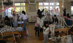 まずは、新聞紙を細く長くちぎる活動をしました。新聞紙のむきに気をつけながら慎重にちぎる子、思い切ってやぶる子、色々試して楽しそうでした。次に、細長い紙同士をつなげていきます。思い思いにつなげていったり天井からつるしたひもにかけていったりしました。紙同士をどんどんつなげて、最後はクラス全体の大きな作品ができあがりました。