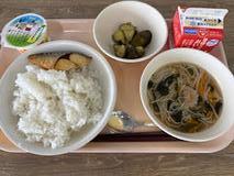 ごはん ごま塩 たらの梅ソース 吸い物 牛乳