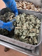 ちくわの磯辺揚げは、小麦粉・あおさ・水で作った衣をちくわにからめて、油で揚げます。宮崎小学校では590本のちくわを使用しました。