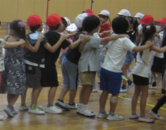 じゃんけん列車では、初めて話す子とも笑顔でつながり、長い列車になりました。