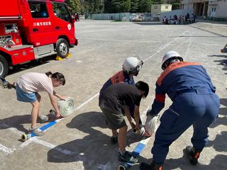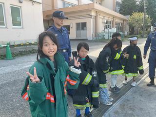 消防車の説明、ホースの延長体験、防火服体験、消防士さんの仕事内容を知れるDVDの視聴の4ブースを用意していただき、火事からまちを守る工夫についてたくさん学習することができました。体験することで、自分事として考える姿も見られ、「消防士さん、かっこいい!」との声も!