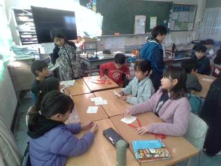 なかよし集会で交流している2年生と書初め大会の感想交流を行いました。