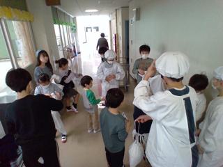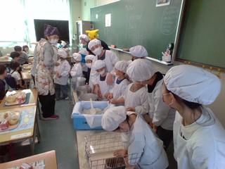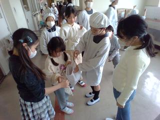 また、1年生に割烹着の着方やたたみ方、配膳や準備の仕方、運ぶときの注意点、牛乳パックのたたみ方など給食についての手伝いに行きました。自分たちから進んで行動して1年生に丁寧にわかりやすく伝えました。