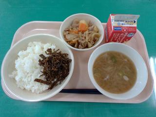 今日の給食「ごはん 茎わかめの佃煮 肉じゃが みそ汁 牛乳」茎わかめの佃煮も久しぶりの登場でした。肉じゃがも美味しい季節となりました。