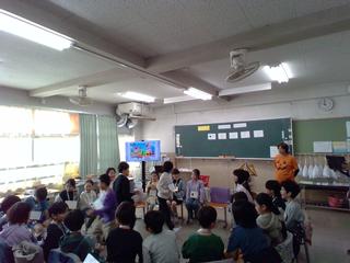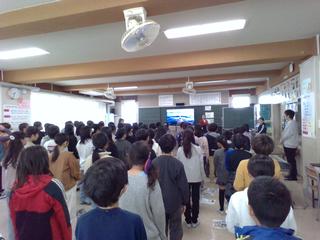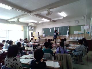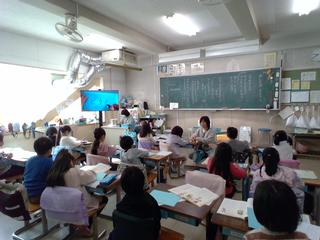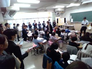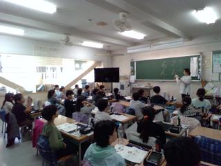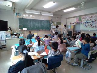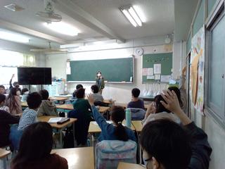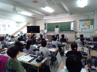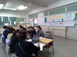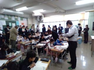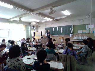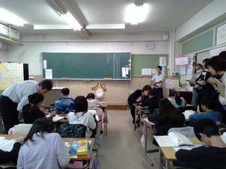 授業はこんな感じで教室の周りは先生でいっぱいです。子供たちの表情を見たり、ノートに書いている感想を見たりしています。