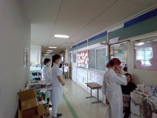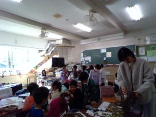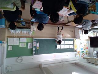 1年生の生活科。あした幼稚園との交流会があります。そこで「秋のお店さん」を開くようです。今日はその最後の準備とリハーサルです。