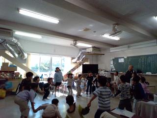 1年生の物語からの一コマ。子どもたちが、声を合わせてジャンプする場面を、実際にクラス全員で動作化していました。楽しそうですね。