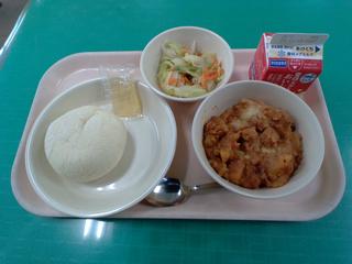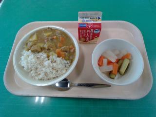 今日の給食です。「チキンクリームライス(ターメリックライス) やさいソテー 牛乳」 チキンクリームライスは、一年ぶり?の登場です。ホワイトソースのルーは、いつものカレーやハヤシと色合いや風味は違いますが、やっぱり「ペロリ」と食缶は空になりました。