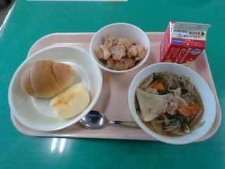 今日の給食「はいがロールパン とり肉のから揚げ ワンタンスープ りんご 牛乳」 久しぶりのパン食です。