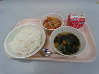 今日の給食 新献立です。「ごはん タッカルビ わかめとコーンのスープ 牛乳」