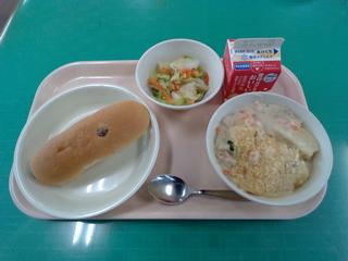 今日の給食「ぶどうパン ポテトグラタン キャベツのソテー 牛乳」最近ぶどうパンがよくでますね。