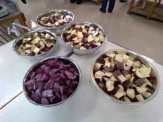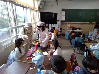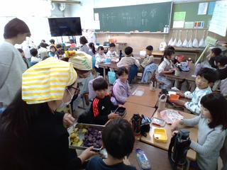 朝方は曇天の平小でした。1,2年生は「さつまいもパーティー」を行いました。栄養士さんや保護者ボランティアの皆さんのお力もお借りして楽しい時間を過ごすことができました。準備をしてただいている間に、おイモについての豆知識講座を栄養士さんから教えていただきました。