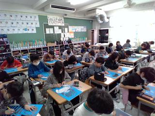 4年生の図工。木版画に挑戦です。彫刻刀を使っての作品は初めてなので、安全面にはしっかり。彫る方向を一定にして、版の向きをかえて取り組んでいます。