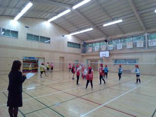 4年生の体育。ネット型ゲーム「ソフトバレーボール」をしています。名前の通り、柔らかくて軽いビーチボールのようなボールを使っています。軽いので滞空時間が長く「繋ぎ」やすくしています。コートにもプレイヤーは3名で、誰もがボールに触れられるように配慮しています。今日は教育委員会の方が指導に来てくださいました。