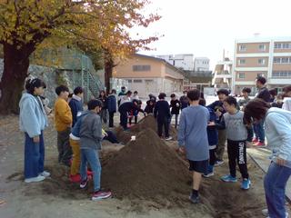 5年生が砂場に大きな高い山を作っていました。これは理科の「流れる水のはたらき」の学習です。このあとジョロの水を流し、水の流れる道を検証していきます。予想はどうだったでしょうか。