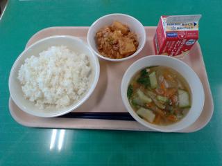 今日の給食「ごはん 生揚げの四川煮 春雨の中華スープ 牛乳」でした。 中華めメニューの定番の献立です。