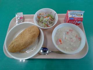 きなこパンは、コッペパンを給食室で揚げています。生地がふわふわでとてもおいしいです。コッペパンが甘めの味付けなので、普段は気にしていませんが、和風ドレッシングが少し辛めに感じました。