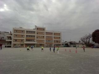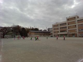 3年生の体育。太陽が隠れてしまい風が吹く中、元気いっぱいにサッカーをしていました。柔らかいボールを使っているので、みんな思いっきりプレイしていました。体は温まったかな?