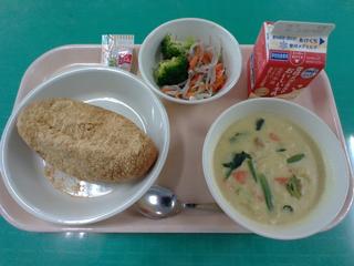 ボイル野菜のブロッコリーとカレーシチューのほうれん草の緑が色も味も効いています。カレーシチューには、隠し味?でチーズも入っています。 子どもたちに一番人気の「きなこパン」6年生は、あと何回食べられるのかな?