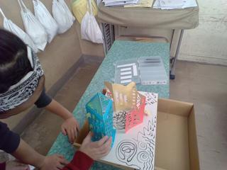 2年生の図工。以前にも載せていました。初めてのカッターで窓を切っています。